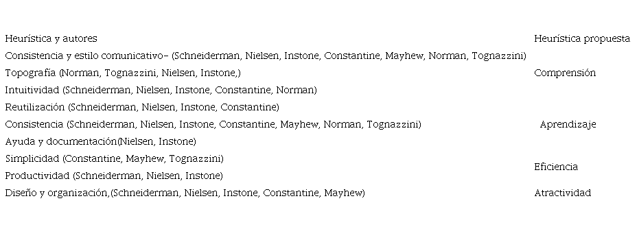 En la Tabla 2, se muestra la asociación de las heurísticas propuestas, con las definidas por los autores referentes.