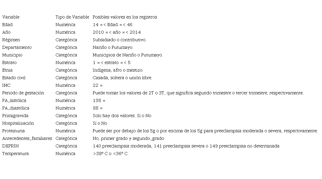 Gracias a los datos proporcionados por el Hospital Universitario Departamental de Nariño, se identificaron variables de tipo demográfico y médico de cada una de las pacientes. Los datos demográficos hacen referencia a la información general de cada paciente y se definen generalmente como variables de tipo categórico. Las variables médicas son resultado del examen de valoración o pruebas de laboratorio y pueden ser de tipo numérico o categórico. Para el estudio realizado no se tuvieron en cuenta las variables demográficas, dado que no permiten hacer generalizaciones por tratarse de datos muy descriptivos de cada paciente. Con respecto a las variables médicas, se consideró que todas eran importantes para la definición del perfil de las pacientes con preeclampsia, quedando el bloque de variables que se presenta en la Tabla 1: