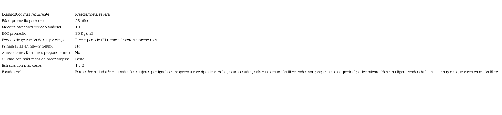 Los clusters generados con la técnica EM permitieron hacer una relación más directa entre las diferentes variables que componían cada uno de los registros que suministró el Hospital Universitario Departamental de Nariño. De acuerdo con los datos del apartado anterior y con la técnica aplicada, fue factible generar el perfil o caracterización para las pacientes con preeclampsia que son atendidas en el Hospital, el cual se puede observar en la Tabla 2.