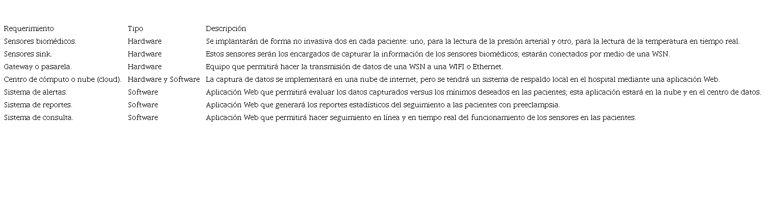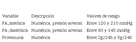 De acuerdo con lo anterior y al identificar que la patología más recurrente fue la de preeclampsia severa, se dedujo, acorde con las características de la misma, que las variables médicas que se deben analizar y a las que se debe hacer seguimiento mediante un sistema de monitoreo con WSN, son las que corresponden a la presión arterial, que se deriva de las variables PA_sistólica y PA_diastólica, como también a la proteinuria, las cuales se enumeran con respecto a los valores de riesgo en la tabla 3.