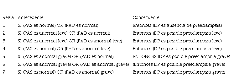 Variable de salida: acorde con las variables de entrada que corresponden a los valores de la presión arterial PAS y PAD, se tiene como variable de salida el posible diagnóstico de la paciente (DP), el cual podrá tener los siguientes valores lingüísticos: ausencia de preeclampsia, posible preeclampsia leve, posible preeclampsia grave. Estas variables se conjugan con las de entrada mediante la herramienta que brinda la lógica difusa y se denominan “Reglas difusas”, las cuales se mencionan a continuación.