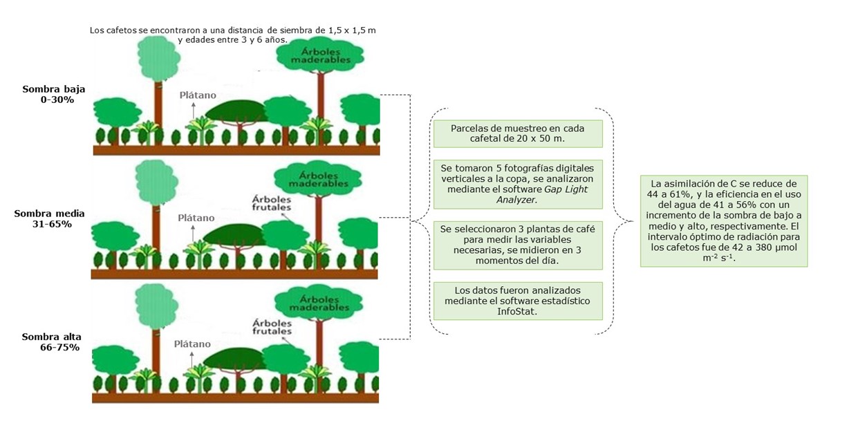 La fotosíntesis es fuertemente afectada por factores ambientales como la radiación fotosintéticamente activa incidente, la disponibilidad de agua, la temperatura, la humedad relativa y el nivel ambiental de CO2(Taiz y Zeiger, 2006; Castilla, 2013; Martins et al., 2014). El comportamiento ecofisiológico de las plantas se puede estudiar con las curvas de luz, siendo el punto de compensación aquel donde la incorporación de CO2 en la fotosíntesis es igual a la liberación de CO2 en la respiración; mientras que en el punto de saturación no hay un aumento en la incorporación de CO2 a pesar del incremento de la radiación. El objetivo de este estudio fue evaluar el efecto de nivel de sombra en el comportamiento ecofisiológico de cafetos (Coffeaarabica L.) en San Juan de Rioseco, Cundinamarca, Colombia. Los resultados son importantes para el diseño y manejo de SAF con café, principalmente en términos de sombrío y permitirán que los productores logren sistemas ganar-ganar, que permitan incrementar la producción y ofrecer servicios ambientales (Andrade et al., 2014).