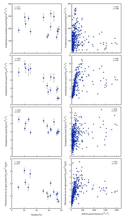 Relación entre el porcentaje de sombra y la radiación fotosintéticamente activa incidente (RAFAi) (dado como el flujo fotosintético de fotones) y variables ecofisiológicas de cafeto (Coffea arabica L.) cv. Castillo en SAF en San Juan de Rioseco, Cundinamarca, Colombia. Las barras de error corresponden a error estándar de la media.