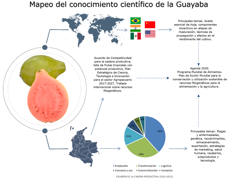 Contextualization: The guava is a fruit of great commercial importance in more than sixty countries. It is consumed fresh or processed and is used in agribusiness for various derivatives of the fruit, seeds, and leaves. World production in 2020 was 2,075,000 tons, with Pakistan being the main producer with 22% share, Brazil 17%, India 16%, Mexico 15%, and Colombia 8%. It is a product of interest within the World Food Program, Global Plan of Action for Plant Genetic Resources for Food and Agriculture, Agenda 2030, and an alternative resource to address the food crisis and unemployment in developing countries. Colombia has organized its production chain and identified research, development, and innovation (R&D&i) needs, which can be related by links and serve as a guide for analysis, where knowledge is a vital resource for development and social transformation.