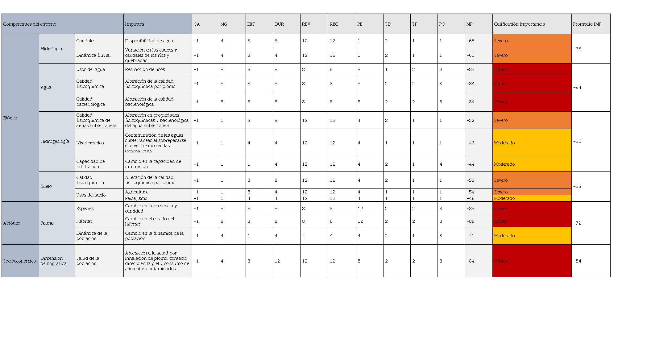 Con este resultado se obtuvieron calificaciones Irrelevante (< -25), Moderado (-25 a <-50), Severo (-50 a -75) y Critico (> -75), esto permitió clasificar los impactos e identificar las etapas en las que se requiere implementar medidas de tipo preventivas o correctivas para contribuir a la disminución de los efectos de la contaminación por plomo.