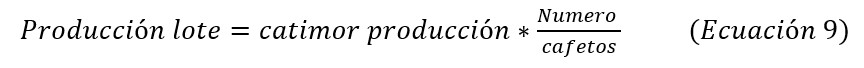 En la presente ecuación, “Producción” corresponde al rendimiento estimado por planta, mientras que “Edad” representa el número de años del cafeto de la variedad catimor. Al sustituir un valor de edad, se puede proyectar la producción individual del cultivo. Con este dato, se calcula el rendimiento total por lote mediante la ecuación 9, denominada modelo de producción por lote para la variedad catimor, que multiplica la producción individual por el número de cafetos registrados: