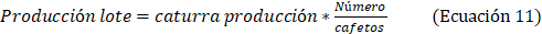 La presente expresión “Producción” representa la cantidad estimada de café producida por cada planta, y “Edad” corresponde al número de años del cafeto de la variedad caturra. La ecuación permite estimar el rendimiento individual al sustituir un valor específico de edad. Una vez obtenida la producción por cafeto, se estima la producción total del lote, utilizando la ecuación 11, denominada modelo de producción por lote para la variedad caturra: