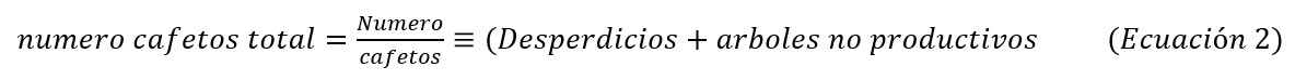 Posteriormente, se estima el total de cafetos efectivos en producción a partir de los registros de campo. El presente cálculo se expresa en la ecuación 2, conocida como modelo de ajuste poblacional, que considera la proporción entre el número de plantas registradas y las pérdidas por árboles no productivos o desperdicios: