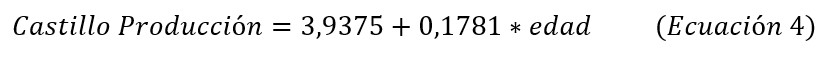 Para la variedad castillo, se aplicó un modelo específico de estimación de rendimiento. La ecuación 4, denominada modelo de producción para la variedad castillo, permite calcular la cantidad estimada de producción por cafeto en función de su edad: