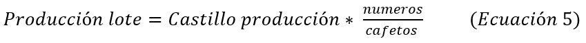 La presente expresión “Producción” representa el rendimiento esperado por planta y “Edad” corresponde a la antigüedad en años del cultivo de esta variedad. Sustituyendo un valor concreto de edad, se obtiene una estimación de la producción individual. Posteriormente, para determinar la producción total por lote, se utiliza la ecuación 5, conocida como modelo de producción por lote para la variedad castillo, que multiplica la producción estimada por el número de cafetos: