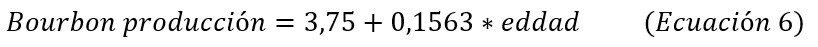 Siguiendo la misma lógica, se desarrolló un modelo para la variedad Bourbon. La ecuación 6, llamada modelo de producción para la variedad Bourbon, establece la producción esperada por planta, según la edad del cafeto:
