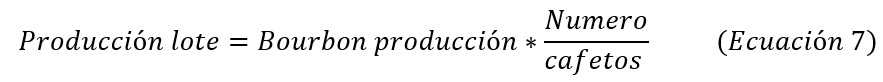 Aquí, al igual que en el caso anterior, se calcula el rendimiento individual estimado al remplazar el valor de la edad. Luego, para obtener el rendimiento total del lote cultivado con esta variedad, se aplica la ecuación 7, denominada modelo de producción por lote para la variedad Bourbon: