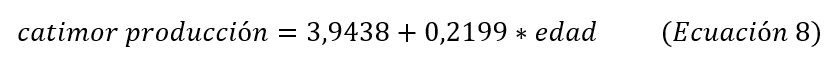 Para la variedad catimor, se aplicó un modelo específico de predicción que estima la producción individual a partir de la edad del cafeto. La ecuación 8, denominada modelo de producción para la variedad catimor, define esta relación: