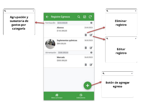 Al pulsar el recuadro correspondiente al registro de egresos, el sistema redirige al usuario a la vista principal del módulo. La figura 13 muestra la pantalla inicial del módulo de egresos, donde se habilitan las opciones de ingreso de datos relacionados con los costos de producción. Una vez se selecciona una categoría de egreso, se despliega la interfaz detallada, como se observa en la figura 14, la cual permite registrar información específica asociada a cada tipo de gasto. Finalmente, la figura 15 presenta la vista de resultados, en la que se resumen los egresos registrados y se generan indicadores clave para la toma de decisiones económicas en la finca.