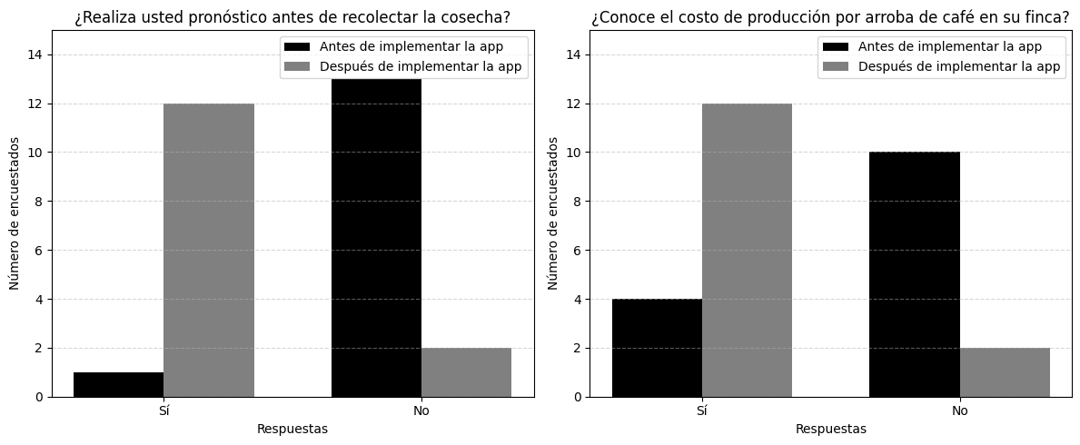 Posteriormente, los datos recopilados en las encuestas se analizan mediante técnicas estadísticas para identificar patrones, tendencias y relaciones significativas en los resultados. Este análisis permite cuantificar de manera objetiva los beneficios concretos de la aplicación móvil, considerando indicadores clave como la mejora en la producción, el aumento de la eficiencia operativa y una toma de decisiones más precisa. Finalmente, los resultados del análisis estadístico se presentan en un informe detallado, en el cual se describen los beneficios medidos y su impacto en la producción de café. Se identifican los hallazgos más relevantes y se incluyen ejemplos concretos de cómo la aplicación móvil ha contribuido a mejorar la productividad y a optimizar la toma de decisiones en las fincas cafeteras. La figura 17 muestra un resumen gráfico de los resultados obtenidos, comparando la planificación administrativa de los caficultores antes y después de implementar la herramienta tecnológica.