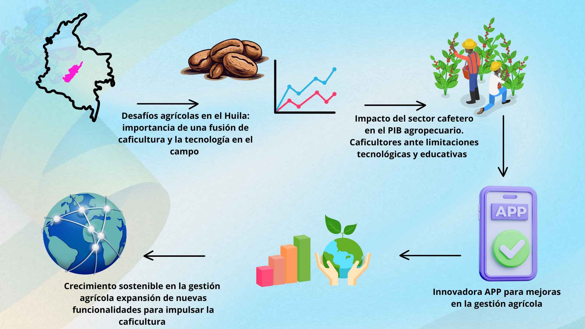 El sector cafetero en Colombia ha sido un pilar fundamental de la economía nacional, “representando aproximadamente el 15 % del Producto Interno Bruto (PIB) agropecuario y generando más de 2,5 millones de empleos directos e indirectos” (Ministerio de Agricultura y Desarrollo Rural de Colombia, 2022). A pesar de su importancia, el sector enfrenta desafíos estructurales y administrativos, particularmente en términos de planificación productiva, gestión de recursos y adopción de tecnologías. “Estas dificultades afectan principalmente a regiones como el departamento del Huila, que se posiciona como el principal productor de café del país, aportando cerca del 18 % de la producción nacional” (Federación Nacional de Cafeteros de Colombia [FNC], 2021).