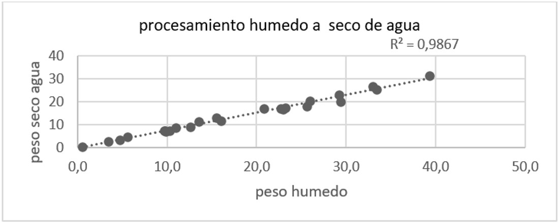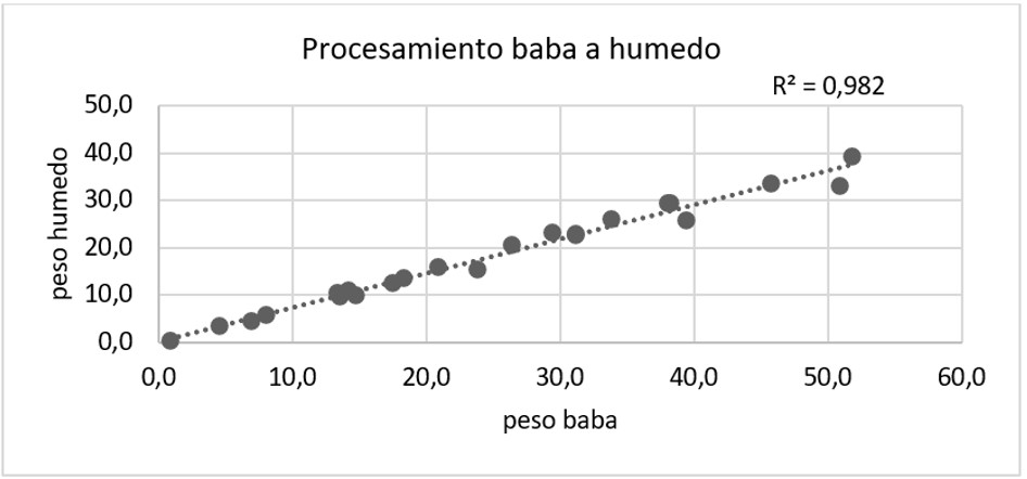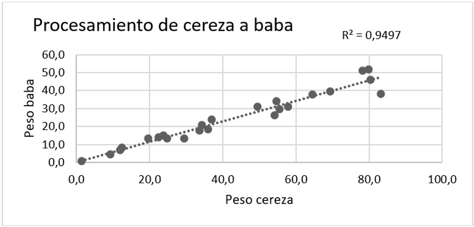 Análisis de correlación: se calcularon los coeficientes de correlación para determinar la relación entre diferentes etapas del procesamiento del café, tales como café cereza, baba, húmedo, seco de agua y pergamino. Se utilizó el coeficiente de Pearson para evaluar la fuerza y dirección de la relación entre las variables. Los datos recopilados incluyeron el peso inicial y final de muestras, revelando correlaciones significativas superiores al 80 % en conversiones clave del beneficio.