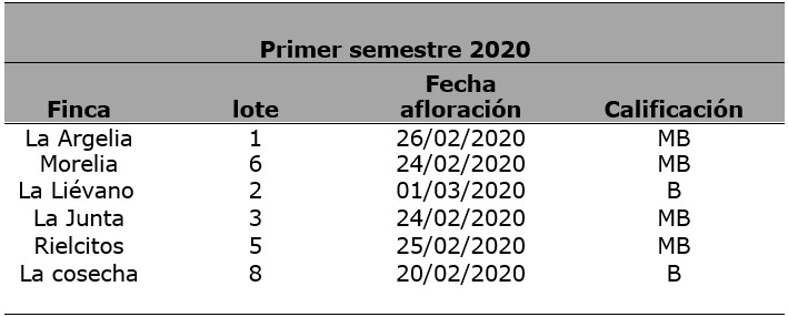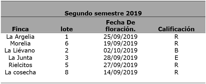En la región sur del país, específicamente en el municipio de Acevedo, donde se encuentran los caficultores del grupo asociativo Bunn San Luis, se presentan floraciones fuertes durante el primer semestre del año y floraciones más débiles en el segundo semestre, como se detalla en la tabla 1 y en la tabla 2. La tabla 1 recopila las fechas de floración y su respectiva calificación durante el segundo semestre de 2019, evidenciando una tendencia hacia floraciones regulares o escasas. Por su parte, la tabla 2 muestra los registros del primer semestre de 2020, en los cuales se destacan floraciones buenas y muy buenas en la mayoría de las fincas evaluadas. Esta comparación permite establecer un patrón estacional en el comportamiento fenológico del cultivo, fundamental para orientar estrategias de manejo agronómico y tecnológico en la zona.