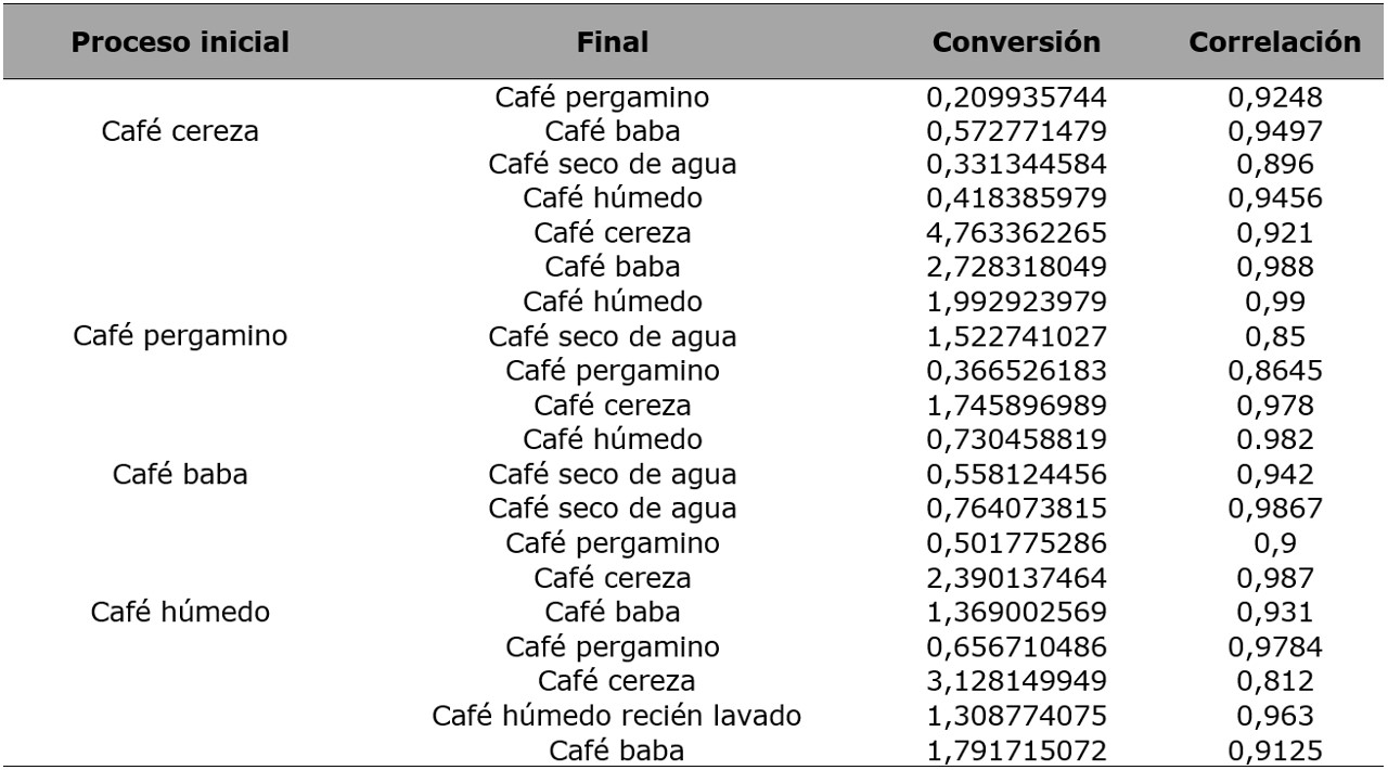 Con base en las correlaciones identificadas en las diferentes fases del procesamiento del café, se presenta la siguiente tabla, que muestra las etapas del beneficio y sus coeficientes de correlación, los cuales superan el 80 %.