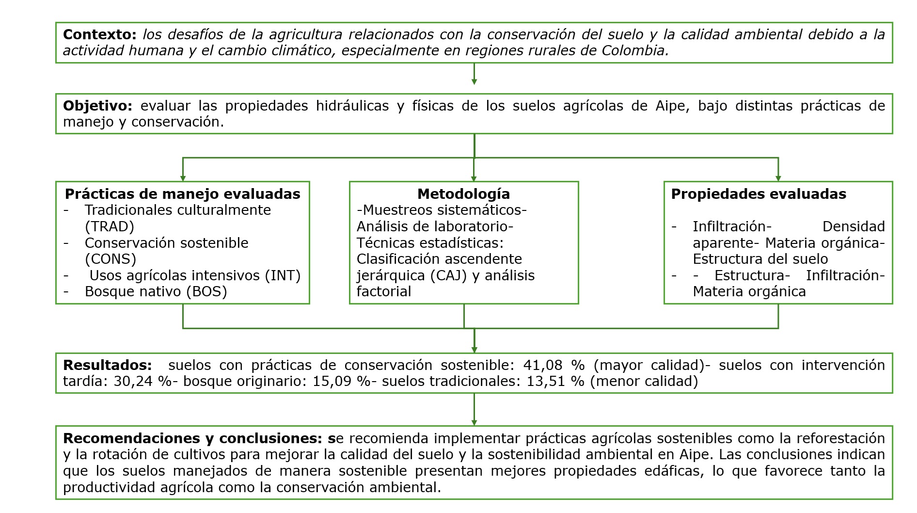 Vacío de conocimiento: estudios previos destacaron la degradación del suelo, causada por prácticas insostenibles, pero existía poca investigación que comparara los efectos de diferentes sistemas de manejo del suelo (tradicional, sostenible, intensivo y bosque nativo) sobre las propiedades hidrofísicas del suelo en Aipe. Este estudio abordó esta brecha mediante la evaluación de indicadores clave, tales como infiltración, densidad aparente, materia orgánica y estructura del suelo.