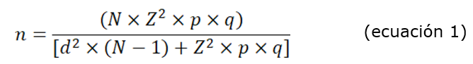 El tamaño de la muestra se estableció mediante un diseño muestral aleatorio simple sin reemplazo, considerando las recomendaciones de Aguilar-Barojas (2005), en investigaciones de tipo cualitativo para determinar para el tamaño muestral a partir de una población conocida como se muestra en la ecuación 1.