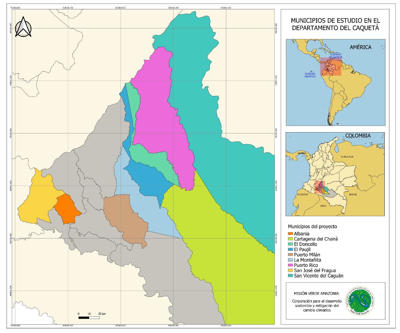 La investigación se desarrolló en nueve municipios del departamento del Caquetá, ubicado al sur de Colombia y al noroeste de la Amazonia colombiana, entre los 00°42’17” de latitud sur y 02°04´13” de latitud norte, y los 74°18´39” y 79°19´35” de longitud oeste de Greenwich, tiene una extensión 88.965 km2 y está divido administrativamente en 16 municipios (Motta-Delgado et al., 2019a); los municipios incluidos en el estudio fueron: Albania, Cartagena del Chairá, El Doncello, El Paujil, La Montañita, Milán, Puerto Rico, San José del Fragua y San Vicente del Caguán (Figura 1), los cuáles acumulan 16.119 agroecosistemas ganaderos que sostienen una población bovina de 1.835.230 semovientes, representando el 85,56% del inventario bovino del departamento.