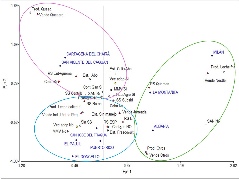 En el análisis de correspondencias múltiples (figura 2) se puede apreciar una discriminación y categorización entre los municipios, donde los agroecosistemas de Cartagena del Chairá y San Vicente del Caguán están más relacionados con la producción y venta de queso, así como al desarrollo de lechería y ceba, los residuos sólidos se entierran y queman (RS Ent+quema), además con el estiércol se produce abono (Est Abo) o se destina a cultivos (Est. Cult+Abo). En un segundo grupo se aprecian los agroecosistemas de los municipios de Milán, La Montañita y Albania; en Milán hay más productores que venden la leche fría que era acopiada por Nestlé. La venta de leche jarreada es más común en La Montañita y Albania, además este grupo presenta una menor seguridad alimentaria (SAN No); un tercer grupo conformado por los agroecosistemas de los municipios de El Doncello, El Paujil, Puerto Rico y San José del Fragua están más relacionados con manejo inadecuado de medicamentos veterinarios (MMV No), baja adopción de la prácticas productivas por parte de los vecinos (Vec Adop No), bajo manejo del estiércol (Est sin manejo) o que se lleva fresco a los cultivos (Est frescoCult) y tendencia a menor continuidad de la actividad ganadera (Con Gan No), siendo este último aspecto más evidente en Albania y San José del Fragua.
