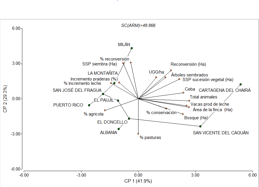 En el Análisis de Componentes Principales ejecutado para las 16 variables obtenidas luego del proceso de depuración empleado, se generaron dos componentes principales que explican el 71,2% de la variabilidad total de las observaciones, este presentó una correlación cofenética de 0,941; se puede apreciar una clara segregación entre los municipios de San Vicente del Caguán y Cartagena del Chairá respecto a los demás analizados, los primeros presentan las mayores áreas de los agroecosistemas, de áreas en bosque, área de sistemas silvopastoriles por sucesión vegetal, la mayor proporción en conservación, mayor número total de animales, de vacas en producción de leche, mayor capacidad de carga, más árboles establecidos y más área reconvertida a sistemas productivos sostenibles, así mismo, son los municipios donde además de producción de leche también se realiza ceba de bovinos, mientras que en los demás municipios destacando Milán y la Montañita se presentó mayor proporción del área reconvertida con sistemas silvopastoriles y división de pasturas, así como los agroecosistemas con las mayores áreas sembradas en sistemas silvopastoriles, de igual manera, La Montañita, San José del Fragua y Puerto Rico evidenciaron el mayor incremento en praderas y en la producción de leche respecto al inicio del proyecto. El Paujil, San José del Fragua, El Doncello y Albania son los municipios que presentaron mayor proporción de área agrícola, y El Doncello, Albania y San Vicente del Caguán presentaron la mayor proporción de pasturas en los municipios analizados (figura 3).