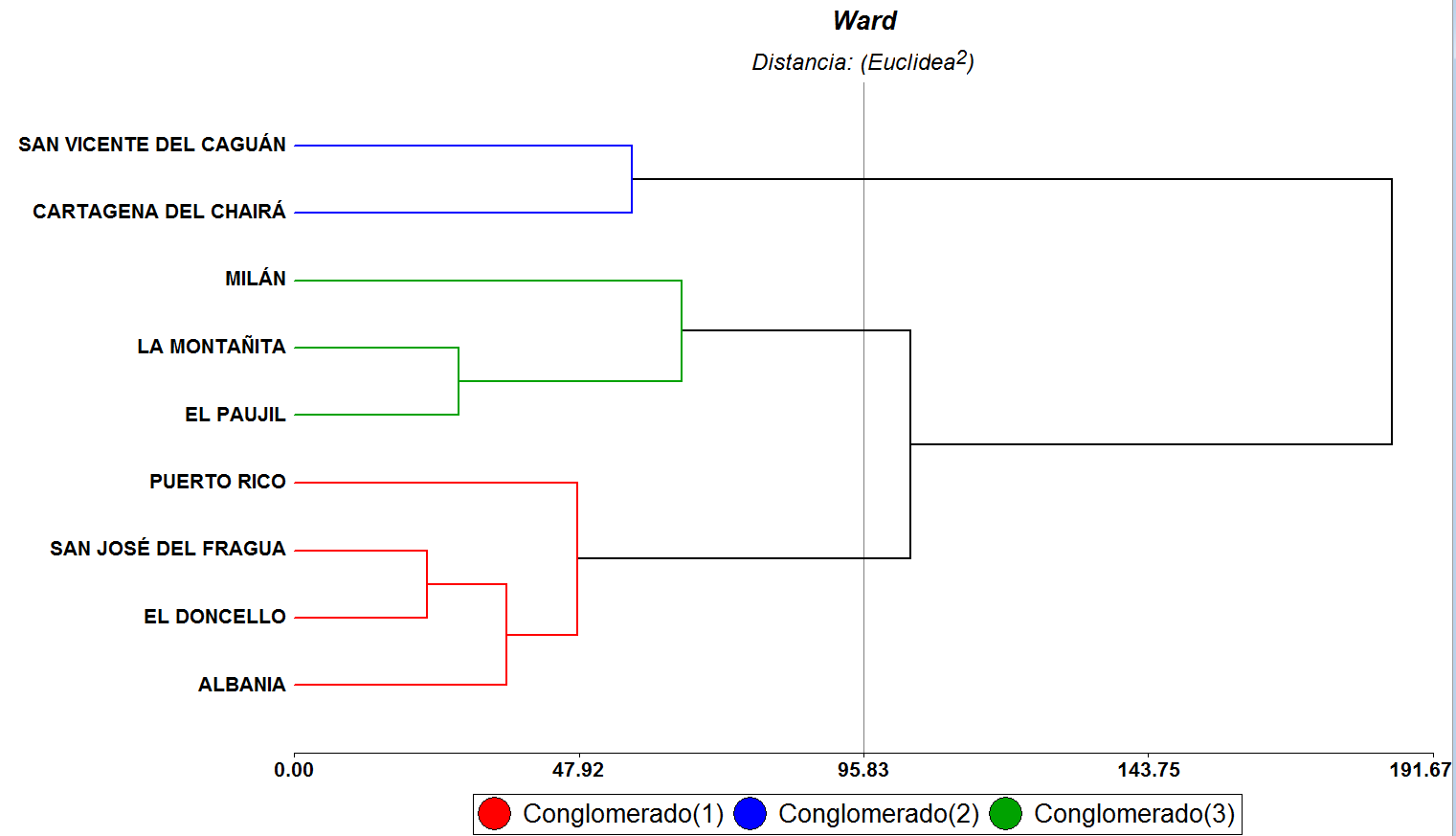 Mediante análisis de conglomerados fueron encontrados tres grupos bien definidos con significación estadística (p<0,0001), grupo 1: Albania, El Doncello, San José y Puerto Rico, grupo 2: Cartagena y San Vicente, y grupo 3: Milán, La Montañita y El Paujil (figura 4).