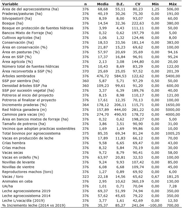 La información fue tabulada en una hoja de cálculo y posteriormente se realizó el procedimiento propuesto por Valerio et al., (2004), para la caracterización y tipificación de agroecosistemas ganaderos; para la caracterización fueron seleccionadas variables cuantitativas, empleando estadística descriptiva que permite determinar las variables con un coeficiente de variación superior al 70%, a las cuáles se les realizó tabla de correlación, eliminando una de las variables con coeficientes de correlación superior al 65%.