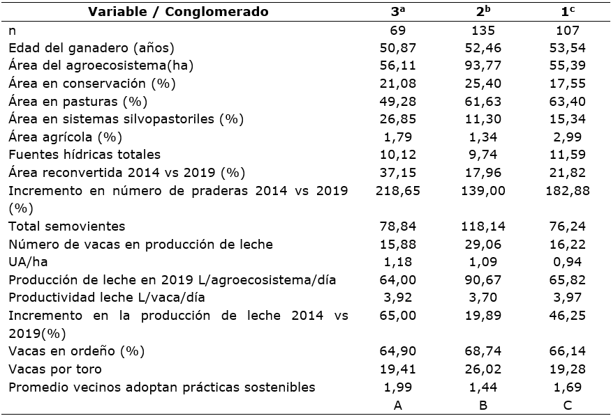 Según el análisis de la varianza multivariado, se encontró diferencia estadística significativa (Lawley-Hotelling p<0,0001), los agroecosistemas ganaderos de mayor extensión corresponden al grupo 2 (Cartagena y San Vicente del Caguán), en este grupo los agroecosistemas tienen el mayor porcentaje de área conservada o en bosque, el mayor número de vacas en producción, y por tanto, la producción de leche por agroecosistema es la más alta, pero la productividad por vaca es la más baja respecto a los otros grupos. El grupo 3 (Milán, Montañita y Paujil) tienen las mayores áreas de sistemas silvopastoriles y mayor porcentaje de reconversión productiva siendo el doble que el grupo 2, además de mayor incremento en división de praderas, mayor capacidad de carga y mayores incrementos en la producción de leche. El grupo 1 tiene la mayor proporción de área agrícola, el mayor número de fuentes hídricas, la mayor longitud de acueducto ganadero y la mayor productividad de leche por vaca respecto a los otros dos grupos. Todos los grupos tienen una adecuada proporción de vacas por toro, siendo bajas en los grupos 1 y 3, así mismo, el porcentaje de vacas en ordeño es bueno, pero no óptimo (75%) (Tabla 2).