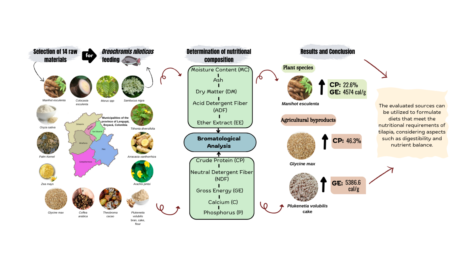 Metodología: El estudio se realizó en la Provincia de Lengupá, abarcando 1645 km², con municipios como Miraflores, Páez, Campohermoso, Zetaquira, Berbeo, San Eduardo y Rondón, en donde se seleccionaron 14 materias primas entre materiales vegetales y subproductos agrícolas (Manihot esculenta, Colocasia esculenta, Morus spp, Sambucus nigra, Tithonia diversifolia, Arracacia xanthorrhiza, Arachis pintoi, Plukenetia volubilis, Theobroma cacao, Coffea arabica Glycine max, Zea mays, Palm Kernel, Oryza sativa), a las cuales se les evaluó su composición nutricional, mediante análisis bromatológico, determinando el contenido de Humedad, Materia Seca, Ceniza, Extracto Etéreo, Proteína Cruda, Fibra Detergente Ácido, Fibra Detergente Neutro, Energía Bruta, Calcio y Fósforo.