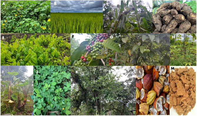 A)Tithonia diversifolia; B) Oryza sativa; C) Zea mays; D) Arracacia xantorrihza; E) Morus alba; F) Coffea arabiga; G) Plukenetia vaolubilis; H) Manihot esculenta; I) Colocasia esculenta; J) Arachis pintoi; K) Sambucus nigra; L) Theobroma cacao; M) Glycine max.