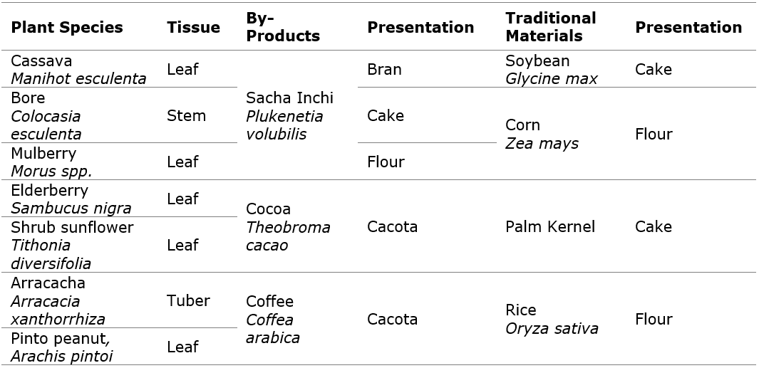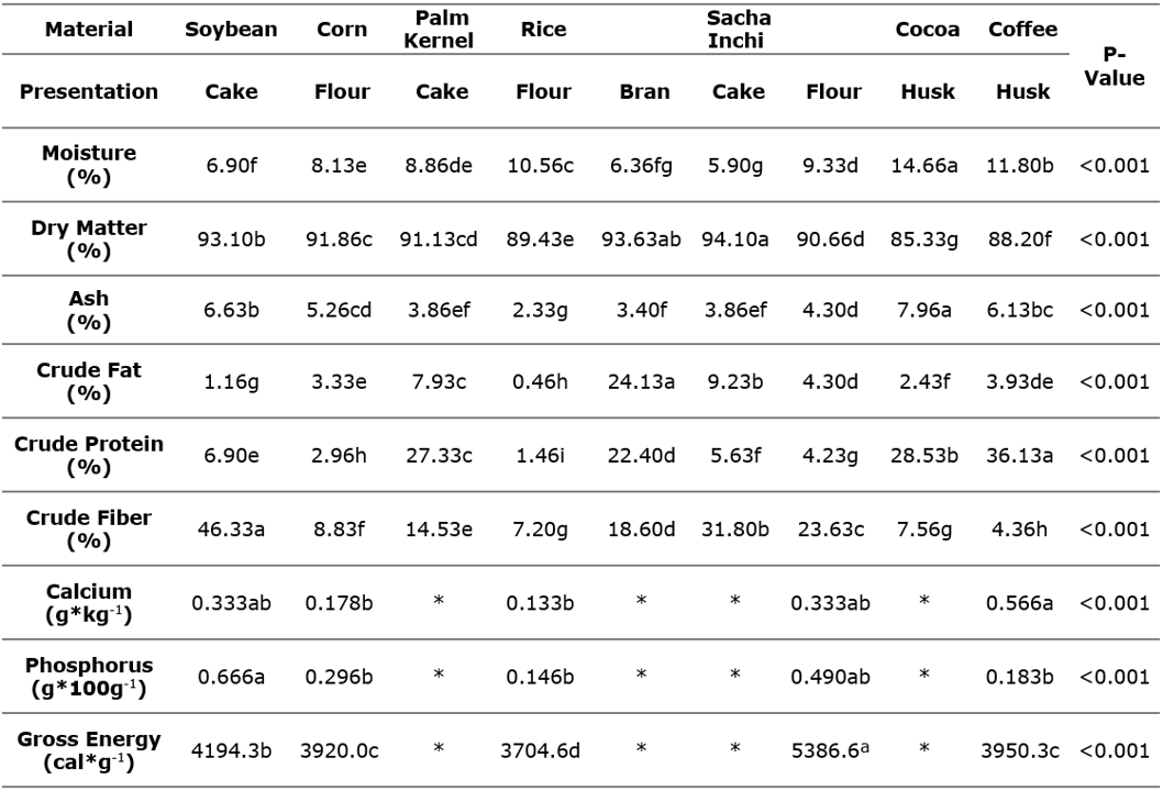 Methodology: The study was conducted in the Lengupá Province, covering an area of 1645 km², including municipalities such as Miraflores, Páez, Campohermoso, Zetaquira, Berbeo, San Eduardo, and Rondón. Fourteen raw materials (Manihot esculenta, Colocasia esculenta, Morus spp, Sambucus nigra, Tithonia diversifolia, Arracacia xanthorrhiza, Arachis pintoi, Plukenetia volubilis, Theobroma cacao, Coffea arabica, Glycine max, Zea mays, Palm Kernel, Oryza sativa) were selected for nutritional composition analysis through bromatological analysis, determining moisture content, dry matter, ash, ether extract, crude protein, acid detergent fiber, neutral detergent fiber, gross energy, calcium, and phosphorus.