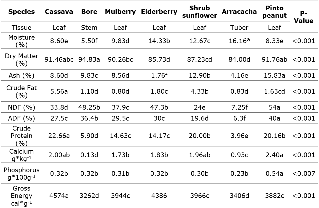Average NDF values of 24% and 33% were observed for Shrub sunflower and cassava, respectively. These values align with those reported by Puerta Rico et al., (2017), who indicated that Shrub sunflower had a low-medium fiber content, mainly represented by lower levels of cellulose and lignin (ADF), which are associated with higher digestibility. However, higher NDF and ADF values, as seen in bore, elderberry, mulberry, and Pinto peanut, could be linked to lower diet digestibility by P. brachypomus. According to the classification standards proposed by the American Forage and Grassland Council (Botello-León et al., 2020), except for bore, the evaluated plant species have an NDF lower than 41%, suggesting they could be classified as forages of excellent quality.