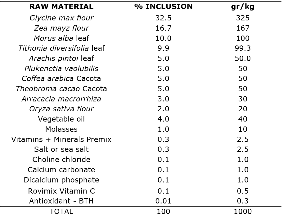 Coffea arabica cacota and Theobroma cacao are rich sources of dietary fiber and antioxidants, although they have a low apparent fiber digestibility (40-50%), their inclusion at low levels promotes intestinal health and acts as a prebiotic (Vázquez-Sánchez et al., 2018; Soares & Oliveira, 2022). Arracacia macrorrhiza provides easily digestible carbohydrates and vitamins, with a positive impact on available energy and nutrient absorption. Its inclusion is strategic to balance fiber and improve the texture of the food (Sánchez-Bustos et al., 2021). Oryza sativa flour contributes to the energy intake and improves the palatability of the diet, with an apparent carbohydrate digestibility of more than 90% in tilapia (Sun et al., 2016).