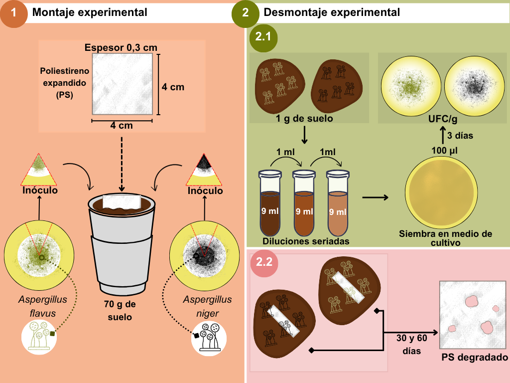 Propósito: evaluar la biodegradación de PS con los hongos Aspergillus flavus y Aspergillus niger, individualmente y en consorcio en el suelo.