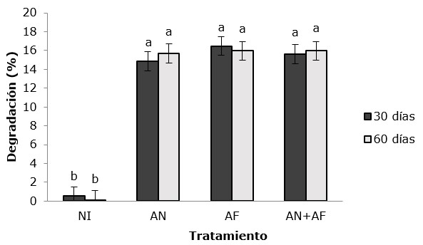 En el diseño experimental se emplearon dos factores: inoculo (control: no inoculado, Aspergillus flavus, Aspergillus niger y el consorcio de ambas cepas) y tiempo de degradación (30 y 60 días).