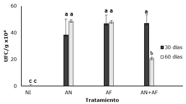 En la figura 3 se presentan los resultados del crecimiento de los hongos Aspergillus niger y Aspergillus flavus en el suelo con presencia del PS a los 30 y 60 días. El tratamiento no inoculado no presentó crecimiento de microorganismos, mostrando que no hubo contaminación de los recipientes en los que se hicieron ensayos.