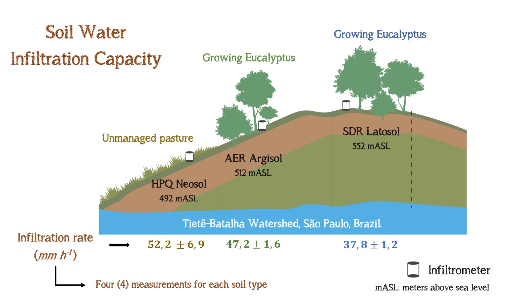 To further contextualize the infiltration rates, additional data on soil texture, including proportions of sand, silt, and clay, along with density and organic matter content, were incorporated. This data was provided by the pulp and paper industry managing the site (Bracell, personal communication, 2022). Tensiometric water retention curves for soil horizons such as Ap, AB, BA, and Bw2 were also provided. These curves measure water retention at various matric potentials, offering insights into the water dynamics in each horizon (Take & Bolton, 2003). This combination of field and laboratory data provides a comprehensive understanding of the factors influencing water infiltration in the study area.