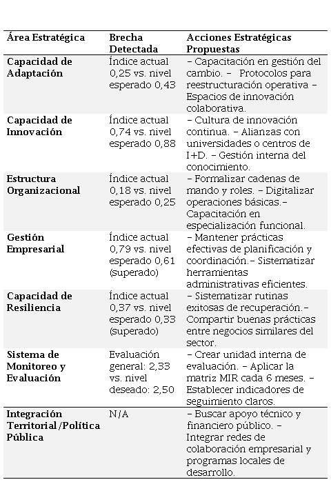 La aplicación de la matriz MIR constituyó una herramienta metodológica eficaz para el diagnóstico y análisis de las capacidades dinámicas. Esta permitió identificar con precisión las brechas existentes entre el desempeño actual y el nivel esperado en cada área evaluada, evidenciando tanto los avances en resiliencia y gestión empresarial como los rezagos en innovación, adaptación y estructura organizacional. Dichas brechas reflejan la necesidad de promover programas de capacitación, asesoría técnica y acompañamiento especializado que fortalezcan las competencias de los propietarios y su equipo de trabajo.