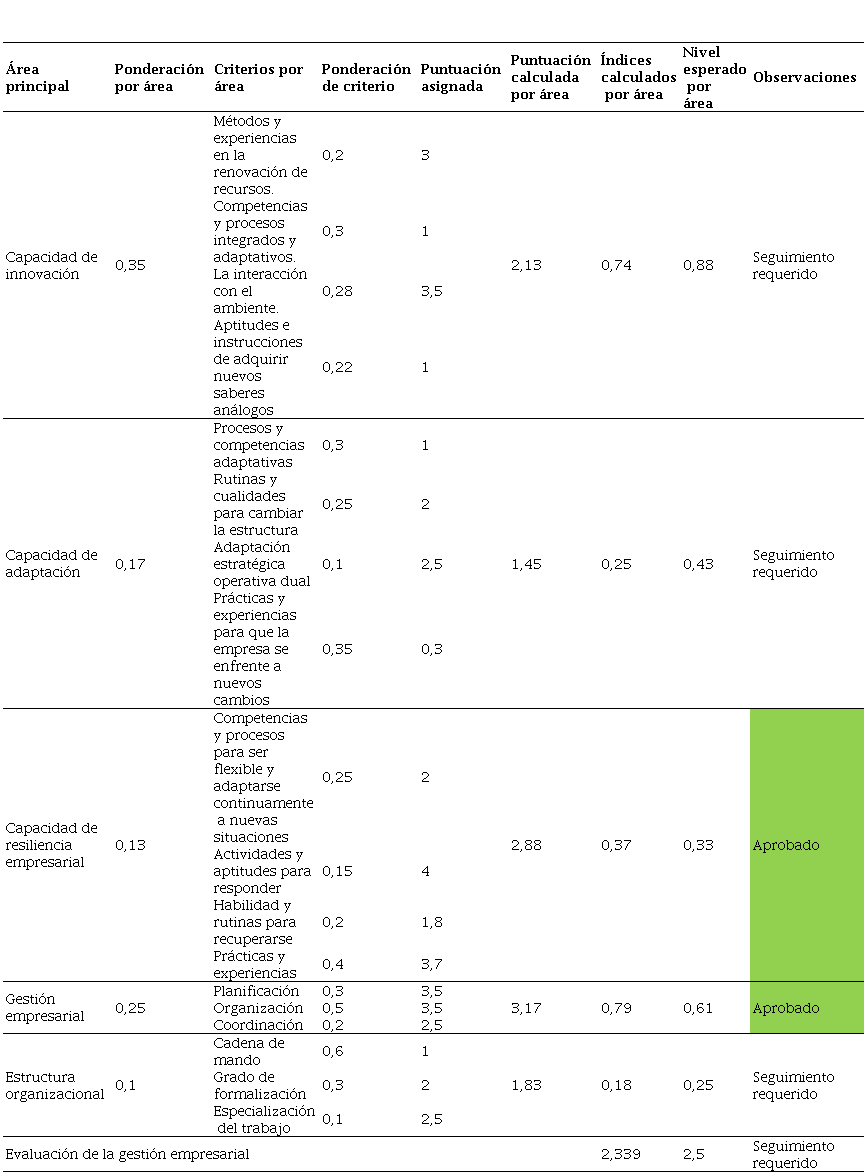 El análisis de la evaluación de la gestión empresarial mediante la ponderación de áreas clave revela una combinación de puntos fuertes y débiles que deben considerarse para la mejora continua. Entre los aspectos fuertes se destacan la gestión empresarial (índice: 0,79) y la capacidad de resiliencia empresarial (índice: 0,37), que alcanzan niveles aceptables gracias al adecuado desempeño en variables como planificación, organización y prácticas resilientes frente a cambios. No obstante, los puntos débiles se concentran en la capacidad de innovación (índice: 0,74 vs. 0,88 esperado), la capacidad de adaptación (0,25 vs. 0,43 esperado) y la estructura organizacional (0,18 vs. 0,25 esperado), áreas que muestran brechas significativas entre los niveles actuales y los esperados. Estas debilidades reflejan limitaciones en la adquisición de nuevos saberes, escasa flexibilidad para asumir cambios estratégicos y una estructura poco formalizada, lo cual compromete la agilidad empresarial ante un entorno competitivo. En conjunto, la puntuación global de 2,339 frente a un nivel esperado de 2,5 sugiere la necesidad de acciones correctivas prioritarias en capacidades dinámicas, especialmente mediante procesos de formación, rediseño organizacional y acompañamiento técnico.