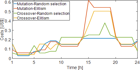 La Figura 2 sugiere que las estrategias que involucran mutación son, en general, más efectivas para mantener los costos bajos en comparación con las que emplean cruce, especialmente durante las horas pico de consumo. Esto podría indicar que la mutación, como método de reproducción puede ser más efectiva para ajustar y adaptar las soluciones de generación de energía en la microrred a los patrones de consumo cambiantes a lo largo del día.