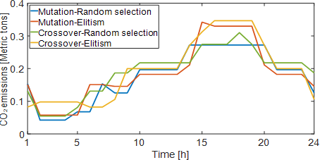 Las estrategias de mutación con elitismo (rojo) y mutación con selección aleatoria (azul) tienden a generar emisiones más bajas durante las horas pico en comparación con las estrategias que implican cruce. Así, las estrategias basadas en mutación podrían ser más efectivas para gestionar la demanda energética de una manera ambientalmente sostenible. La estrategia de cruce con elitismo (naranja) presenta nuevamente las emisiones más altas durante las horas pico, lo que puede indicar una menor eficiencia en la integración de fuentes de energía renovables o en la gestión de la demanda. Las estrategias que logran mantener las emisiones de CO₂ más bajas, especialmente durante las horas de alta demanda, son más favorables desde una perspectiva ambiental, ya que evidencian una mayor eficiencia en la utilización de energías limpias y en la reducción del uso de combustibles fósiles. Además, las estrategias que presentan menor variabilidad y emisiones más estables a lo largo del día resultan beneficiosas para la planificación y la previsión ambiental.
