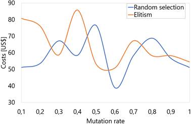 Se observan puntos donde las emisiones de CO₂ se minimizan para ambas estrategias. Por ejemplo, en la curva correspondiente al elitismo, se identifica un punto alrededor de 0,5 en el que las emisiones son mínimas. La identificación de estas tasas óptimas es crucial para establecer la configuración del algoritmo genético que genere la menor huella de carbono y, en consecuencia, los costos más bajos relacionados con las emisiones. Por el contrario, las tasas de mutación que conducen a mayores emisiones de CO₂ pueden incrementar los costos operativos de la microrred, ya sea debido a impuestos sobre el carbono o al gasto adicional en créditos de carbono para cumplir con las regulaciones ambientales.