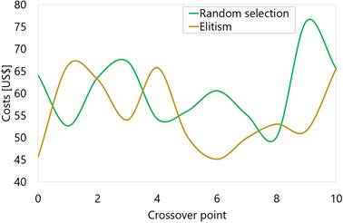 La Figura 6 muestra cómo los costos varían en relación con diferentes puntos de cruce en un algoritmo genético para dos métodos de supervivencia: selección aleatoria y elitismo. El eje de las abscisas representa el punto del cromosoma donde ocurre el cruce. Esto podría reflejar, por ejemplo, la posición en la secuencia de generación y consumo de energía donde se realiza la combinación con otra para crear nuevas soluciones. El eje de las ordenadas indica el costo asociado con cada punto de cruce en dólares estadounidenses.