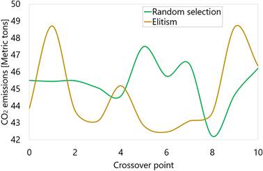 La Figura 7 muestra cómo las emisiones de CO₂ varían según los diferentes puntos de cruce en un algoritmo genético, comparando dos estrategias de supervivencia: selección aleatoria (verde) y elitismo (amarillo). La selección aleatoria exhibe una fluctuación significativa en las emisiones de CO₂ a lo largo de los distintos puntos de cruce. Se observa un pico particularmente alto en el punto de cruce 1, lo que sugiere que el cruce temprano en el cromosoma puede generar una solución menos eficiente en términos de emisiones de CO₂. El elitismo también presenta fluctuaciones, aunque, a diferencia de la selección aleatoria, muestra un valle notable (un punto de mayor eficiencia) alrededor del punto de cruce 6, donde las emisiones son considerablemente bajas. Sin embargo, las emisiones aumentan de forma pronunciada cerca del punto de cruce 10, lo que podría indicar una combinación de genes menos favorable para la sostenibilidad ambiental en esa configuración.