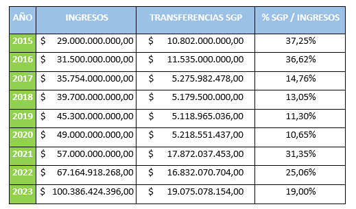 Esto indica, que en Colombia existe una gran cantidad de municipios, especialmente aquellos clasificados entre las categorías cuarta, quinta y sexta, que dependen en gran medida de transferencias nacionales, las transferencias correspondientes del SGP (Sistema General de Participaciones) es una importante fuente de financiación en el país, especialmente en aquellos municipios de quinta y sexta categoría, ya que su capacidad institucional en recaudo tributario no logra las cifras financieras necesarias, sin embargo, para el caso de Segovia Antioquia, en la tabla 5,se puede denotar que estas representan en promedio un 22,12, indicando que esta no es la principal fuente de ingresos de la entidad y que por ende no es dependiente de esta.