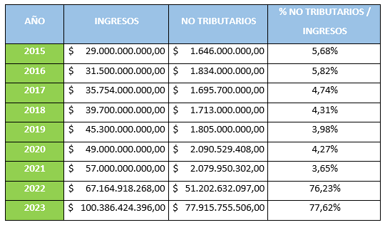 El municipio de Segovia, Antioquia, ha registrado un incremento significativo en sus ingresos entre 2015 y 2023, al pasar de 29.000.000.000 a 100.386.424.396 pesos. Este crecimiento del 246 % en solo nueve años ha sido determinante para ampliar la capacidad administrativa y fortalecer la inversión social. La categorización municipal, que considera factores como el nivel de ingresos y el número de habitantes, permite analizar el proceso de autogestión administrativa de recursos, así como el aporte que representa para los ingresos departamentales y nacionales. Según los registros (ver tabla 3), los ingresos tributarios presentaron un incremento constante hasta 2020. En ese año se evidenció una disminución del recaudo debido a la emergencia sanitaria causada por el SARS-COVID-19. No obstante, dado que la minería es la principal actividad económica del territorio y fue uno de los primeros sectores en reactivarse en Colombia, el municipio logró mantener niveles estables de ingresos sin mayores afectaciones. A partir de 2021, la estructura tributaria sufrió un cambio importante: el impuesto al oro dejó de contabilizarse como ingreso tributario y pasó a clasificarse dentro de las participaciones derivadas de la exploración y explotación de este recurso. Esta modificación permitió al municipio disponer de mayores recursos y avanzar a la categoría tercera. En tan solo tres años, Segovia pasó de la categoría quinta (2020) a la cuarta (2021) y posteriormente a la tercera (2022), de acuerdo con lo establecido en la Ley 617 de 2000.