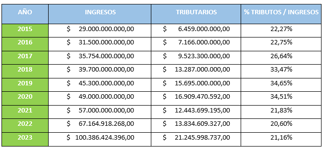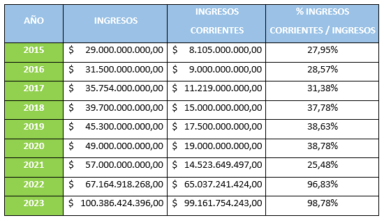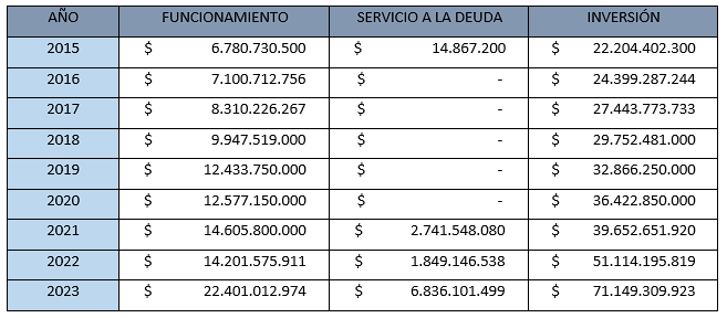 En la clasificación presupuestal de egresos —que se divide en gastos del servicio de la deuda, gastos de funcionamiento y gastos de inversión pública y social— se observa un aumento relevante en la inversión pública: de 22.204.402.300 pesos en 2015 a 71.149.309.923 pesos en 2023, equivalente a un incremento del 159 %. Asimismo, los gastos de funcionamiento pasaron de 6.780.730.500 pesos en 2015 a 22.401.012.974 pesos en 2023, lo que representa un crecimiento del 230 %.